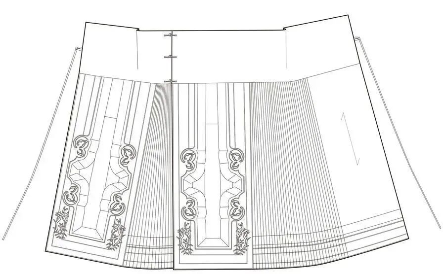 馬面裙在明清時代非常流行,即便在現今電視、電影演繹中也會時常用到,一般前后共四個裙門,兩兩重合,側面打裥,中間裙門重合而成的光面,俗稱馬面。
