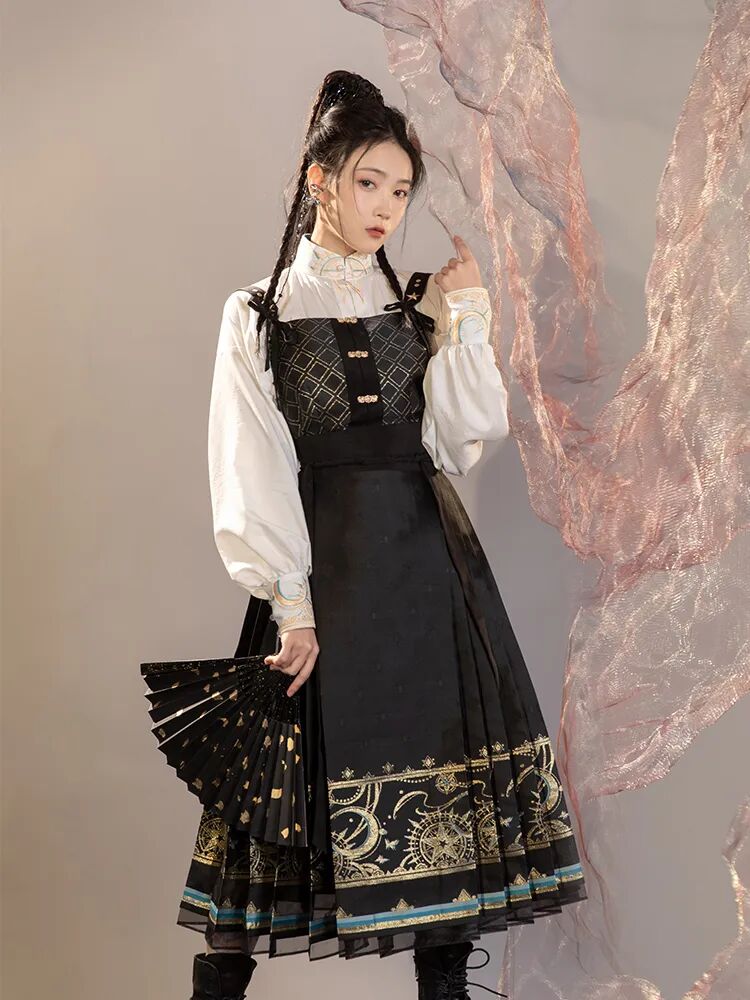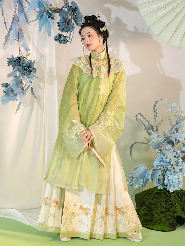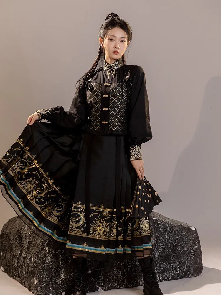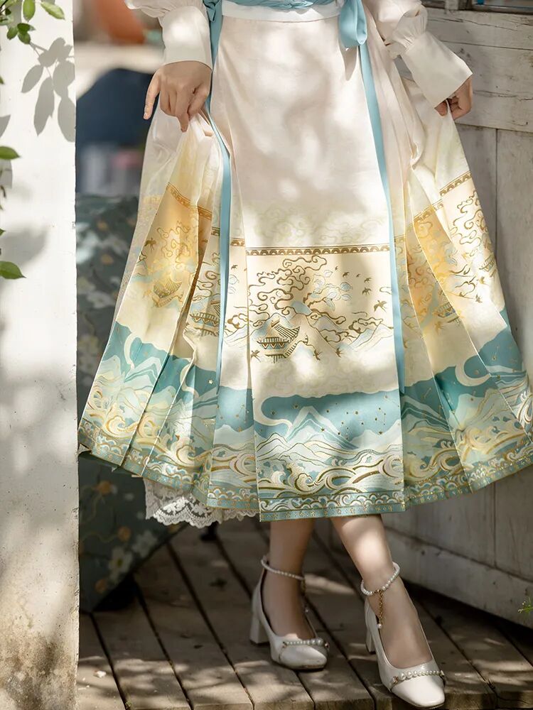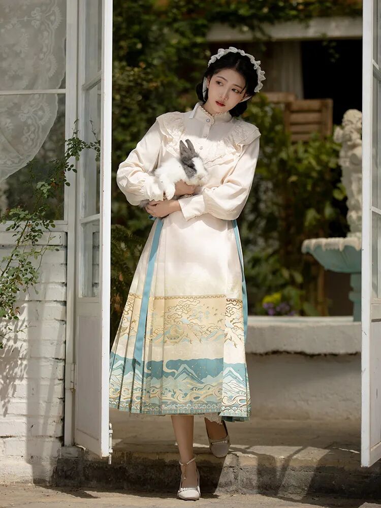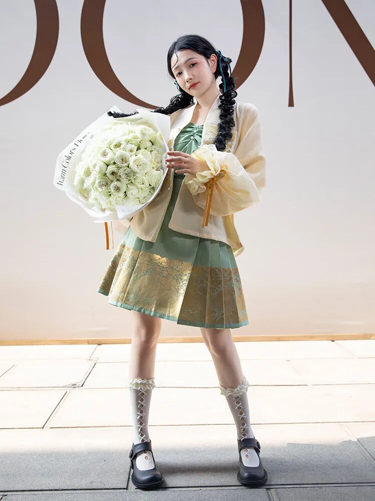 根據(jù)傳統(tǒng)的馬面裙版型,重回漢唐的設(shè)計師們還衍生出許多適合日常穿著的改良馬面裙。穿著是最好的傳承,漢服也可以融于生活。和菌菌一起來看看吧!