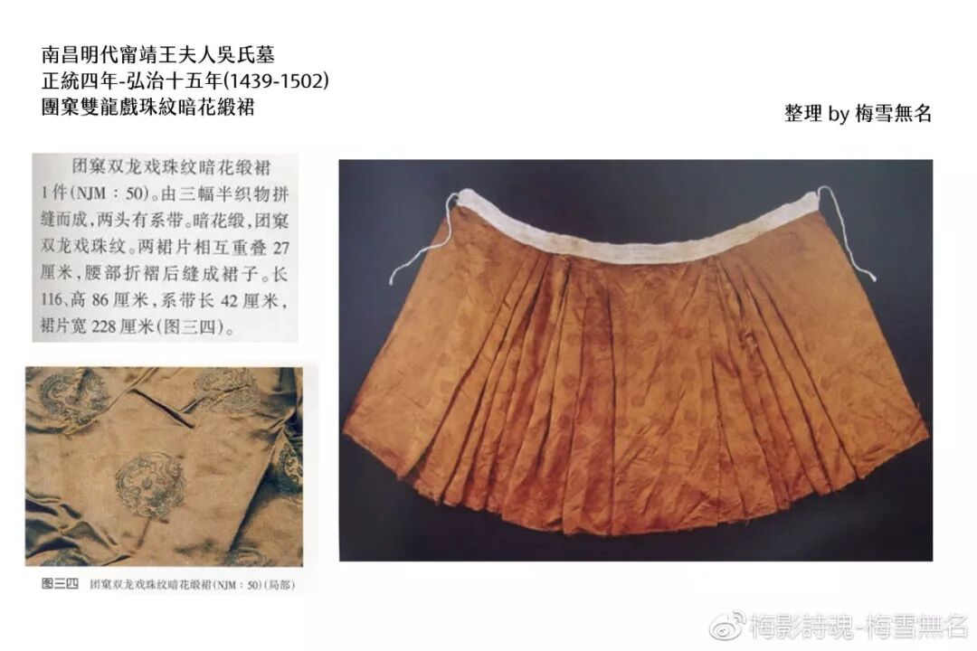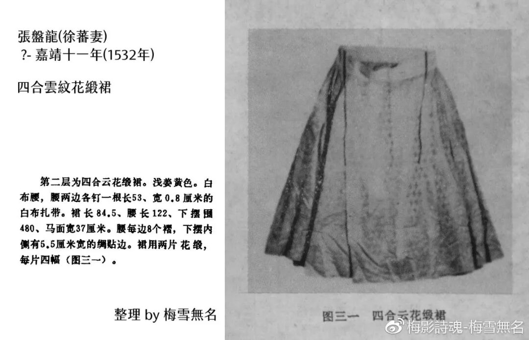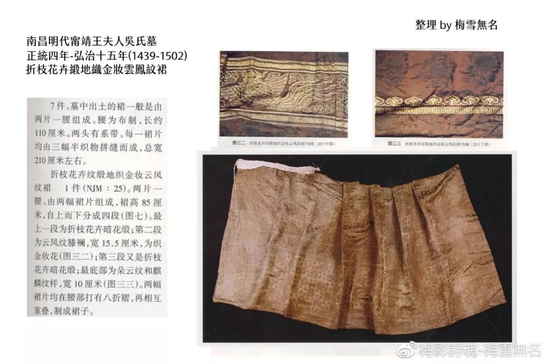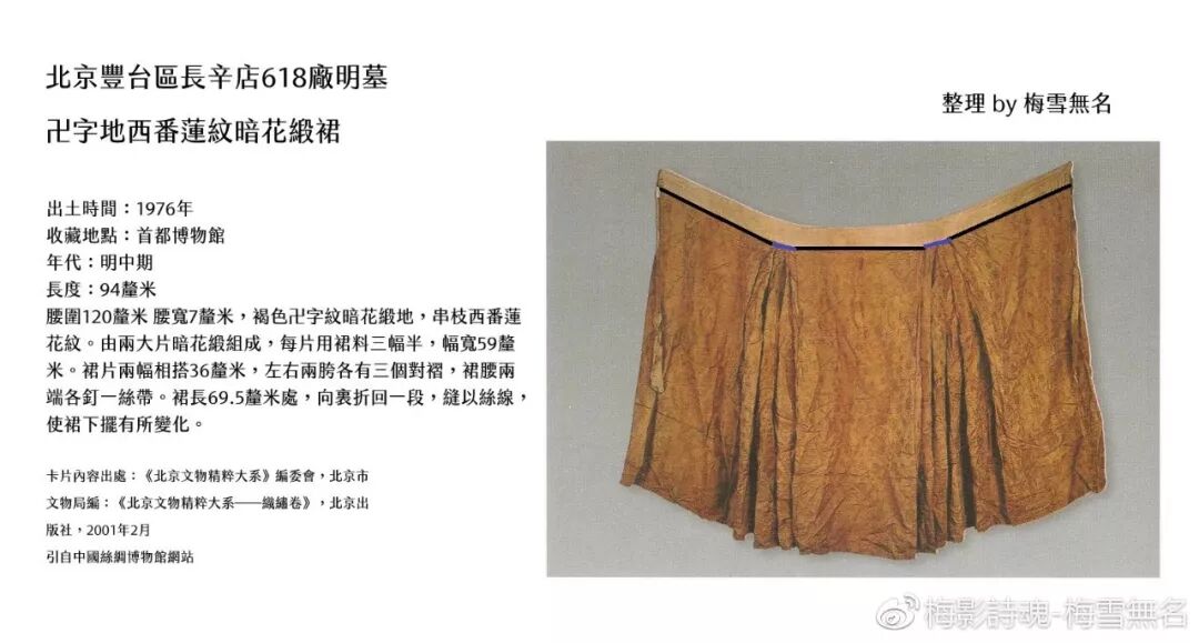 之後用的面料逐漸增加,像是弘治年間寧靖王夫人的裙子,有兩條都明白寫了,單片用三幅半織物拼成,總寬210公分左右,全裙用布量大概是4.2米。而像是定陵也有出土用三幅半拼成的裙子。