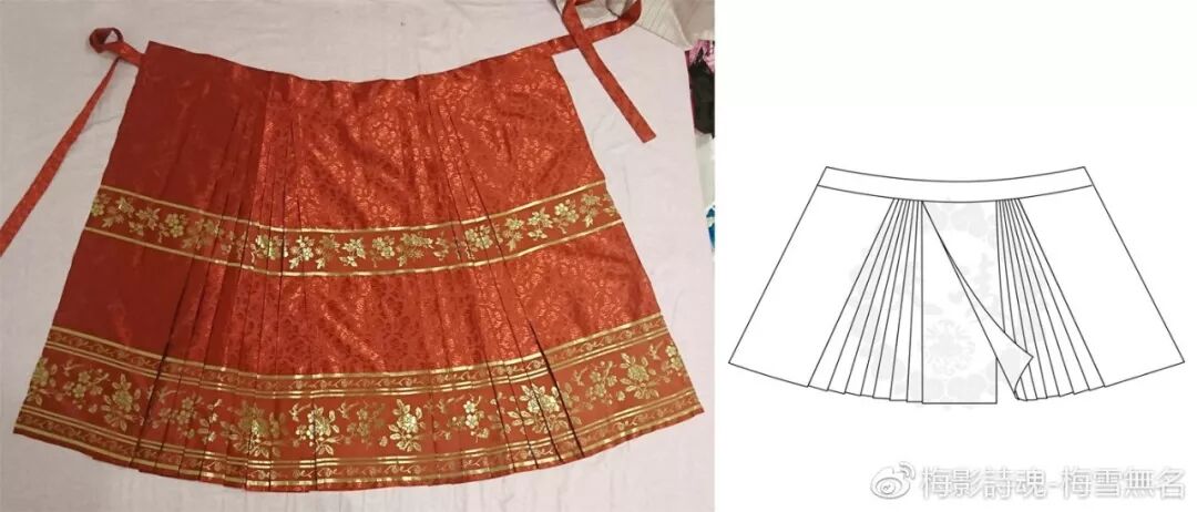 像是定陵的裙子,按照襬幅和復(fù)原品的呈現(xiàn)看來(lái),應(yīng)該是梯形褶的,但是文物線圖卻像是窄裙門。這都支持了東島主人的說法──褶子區(qū)比較寬的話,不管是做平行褶或是梯形褶都可以。