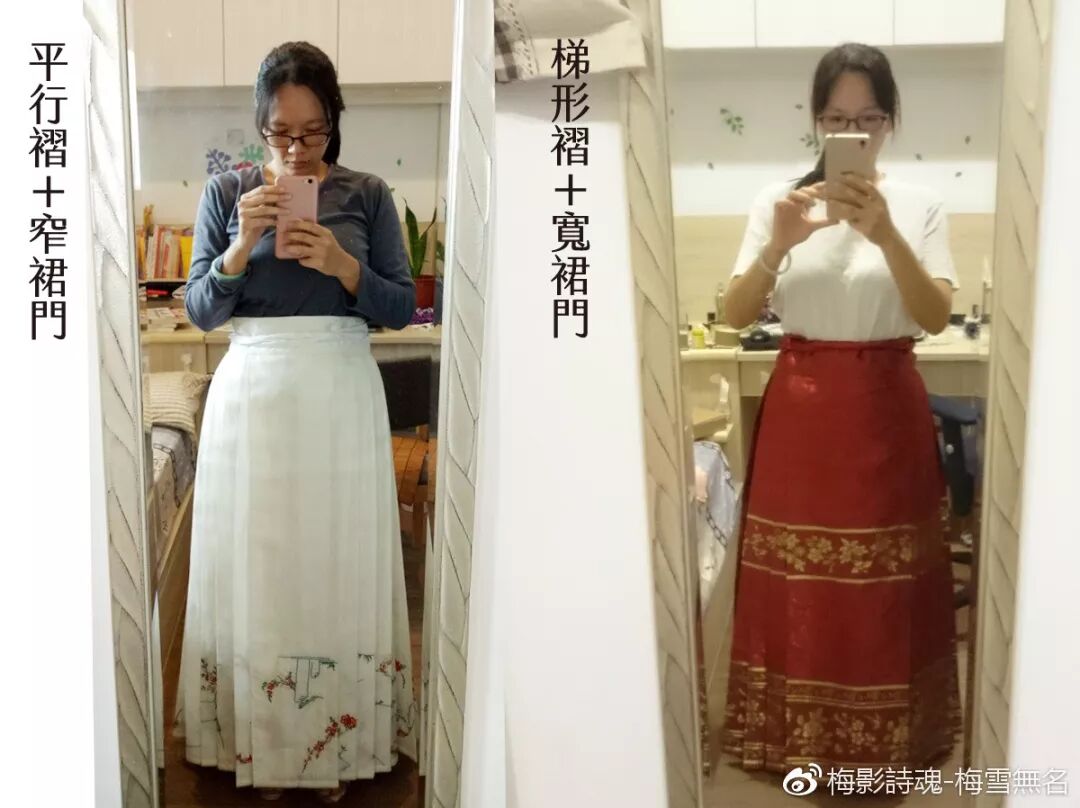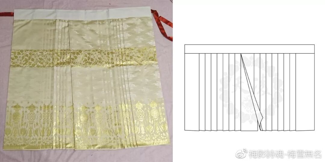 馬面裙的褶子打法有兩種,一種是上下等寬的平行褶,一種是上窄下寬的梯形褶(或稱喇叭褶)。下圖白色裙子,就是平行褶的做法,而紅色這件,則是梯形褶。