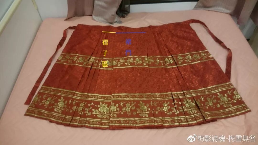 一般常見的裙子是用四幅拼成的,像是張盤龍這件就很明白的寫了,每片四幅,下擺圍480公分。下擺四百多公分是明代馬面常見的數(shù)據(jù),所以一般會(huì)建議做四米襬的裙子。