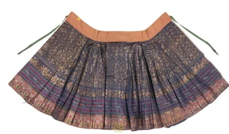 清代的馬面和裙襕的裝飾較為繁復(fù),褶子細(xì)密,有多至百褶的,裙子變?yōu)樗礼蓿拮又g還有鑲邊。因此我們看到的清代馬面裙,更注重刺繡和鑲邊,兩側(cè)還帶有復(fù)雜裝飾的假褶,褶的數(shù)量也更密。而裙門上精細(xì)考究的刺繡花樣,將中國傳統(tǒng)女紅技藝的精湛展現(xiàn)得淋漓盡致。